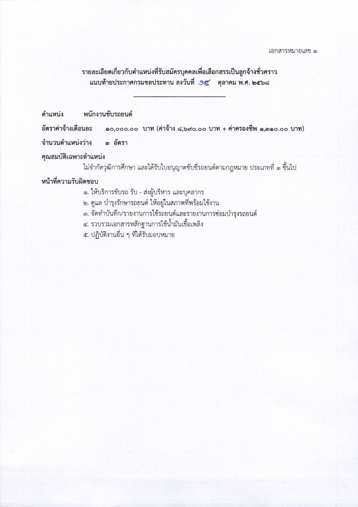 พนักงานขับรถยนต์: มีหน้าที่หลักในการให้บริการขับรถ รับ-ส่งผู้บริหารและบุคลากร, ดูแล บำรุงรักษารถให้อยู่ในสภาพพร้อมใช้งาน, จัดทำบันทึกรายงานการใช้รถและการซ่อมบำรุง, และรวบรวมเอกสารการใช้น้ำมันเชื้อเพลิง