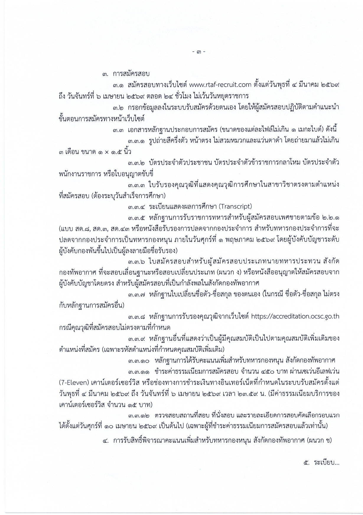 การชำระเงิน: ค่าธรรมเนียมการสมัคร 450 บาท (มีค่าบริการเคาน์เตอร์เซอร์วิส 15 บาท) ชำระได้ที่ 7-Eleven หรือช่องทางออนไลน์ที่กำหนด ภายในเวลา 23.59 น. ของวันที่ 6 เมษายน 2569