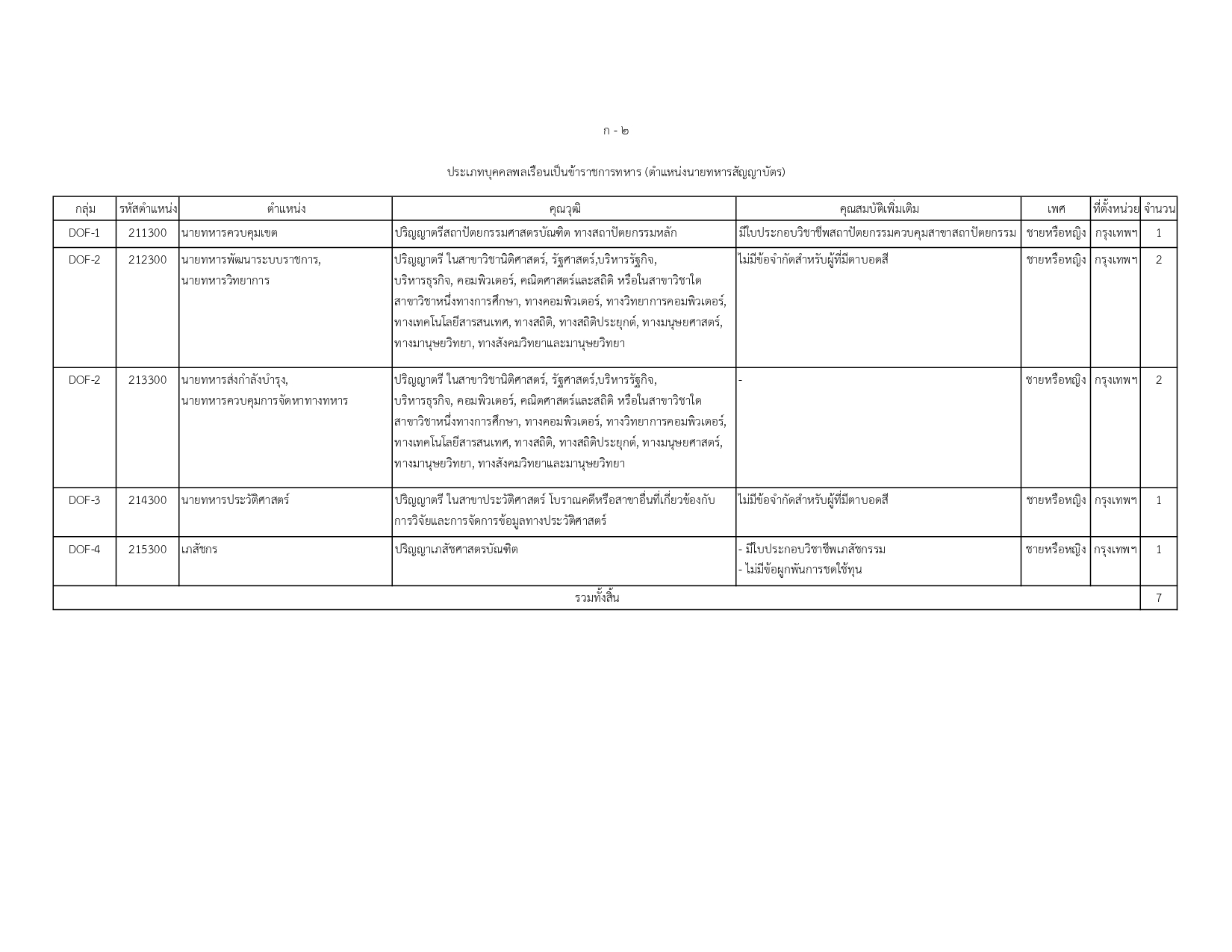 บุคคลพลเรือนและข้าราชการ: ตำแหน่งนายทหารสัญญาบัตร 7 อัตรา และนายทหารประทวน 37 อัตรา