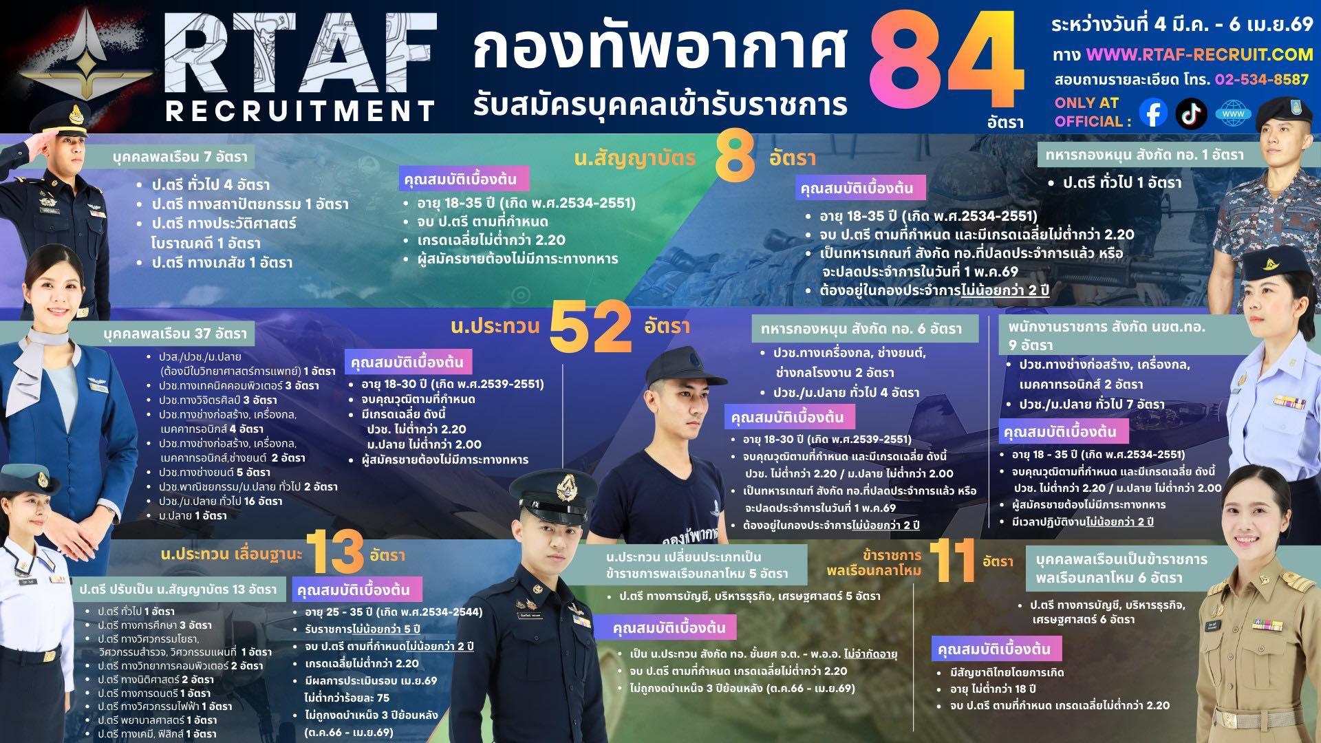 กองทัพอากาศเปิดรับสมัครบุคคลเพื่อสอบคัดเลือกบรรจุเป็นข้าราชการ และพนักงานราชการ รวมทั้งสิ้น 84 อัตรา