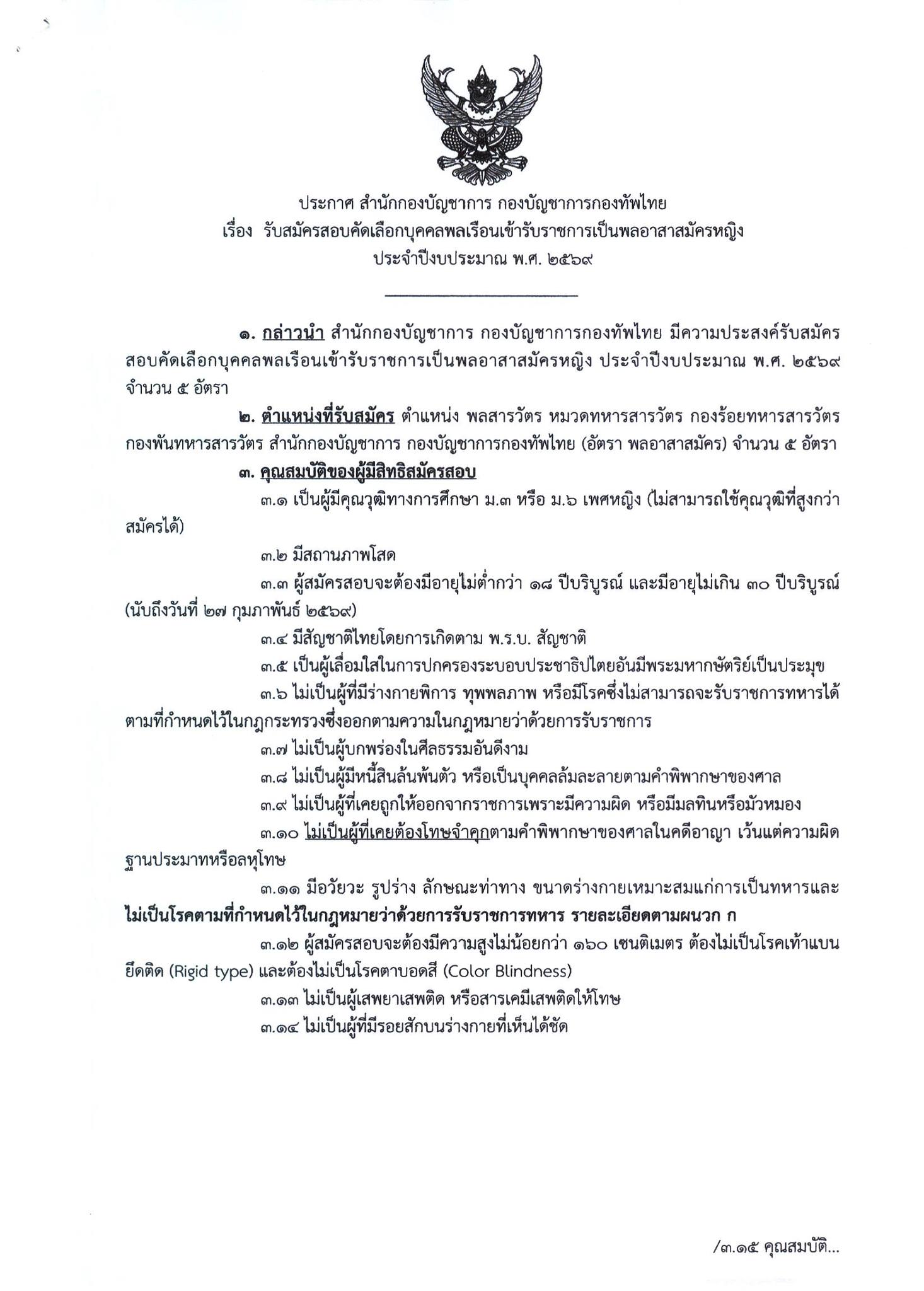 ด้วยสำนักกองบัญชาการ กองบัญชาการกองทัพไทย มีความประสงค์จะรับสมัครสอบคัดเลือกบุคคลพลเรือน (เพศหญิง)