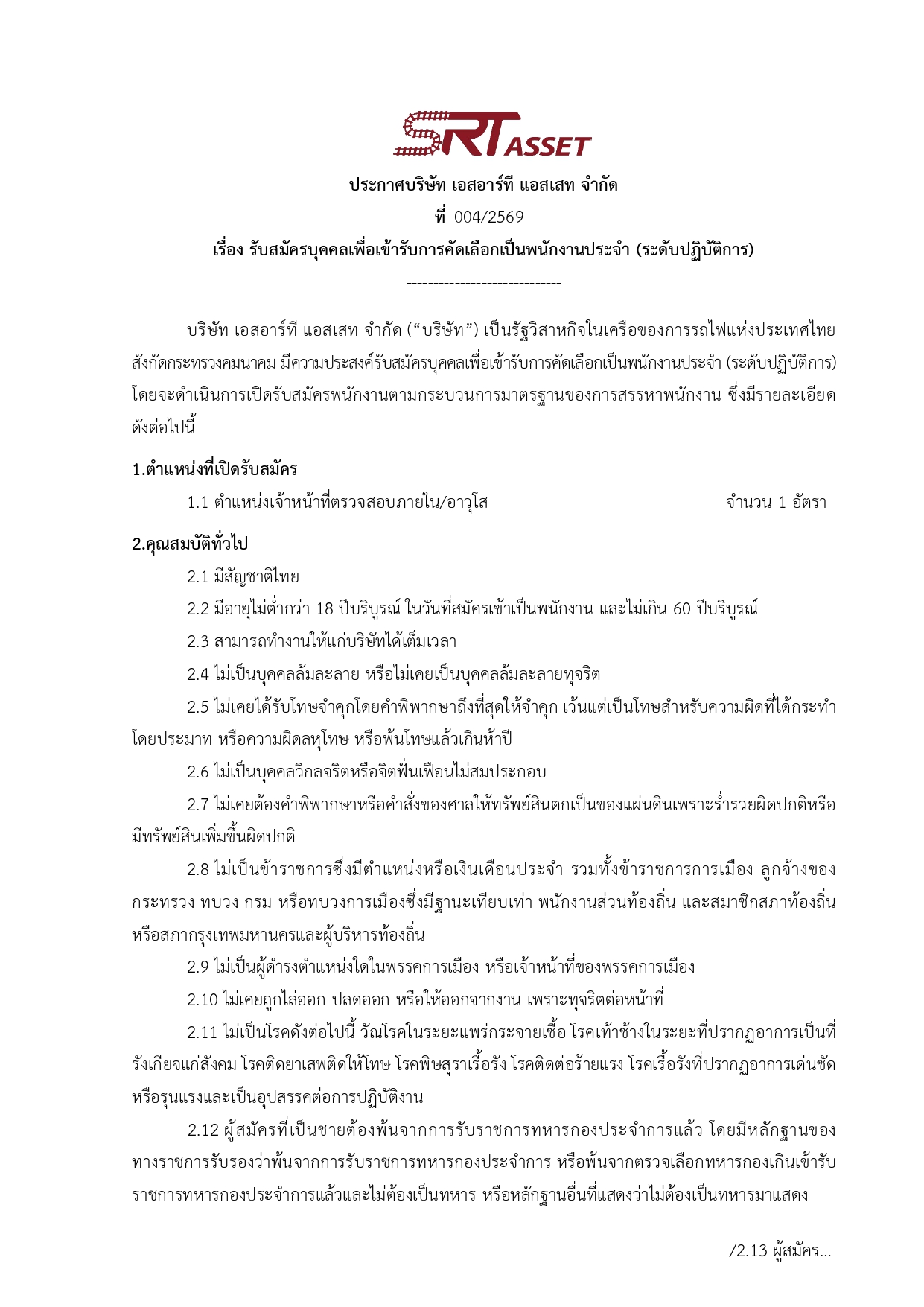 เอสอาร์ที แอสเสท (รัฐวิสาหกิจ) รับสมัครบุคคลเพื่อเข้ารับการคัดเลือกเป็นพนักงานประจำ ป.ตรี หลายสาขา + / ไม่ต้องผ่าน ภาค ก. / ตั้งแต่ 1 – 30 เมษายน 2569