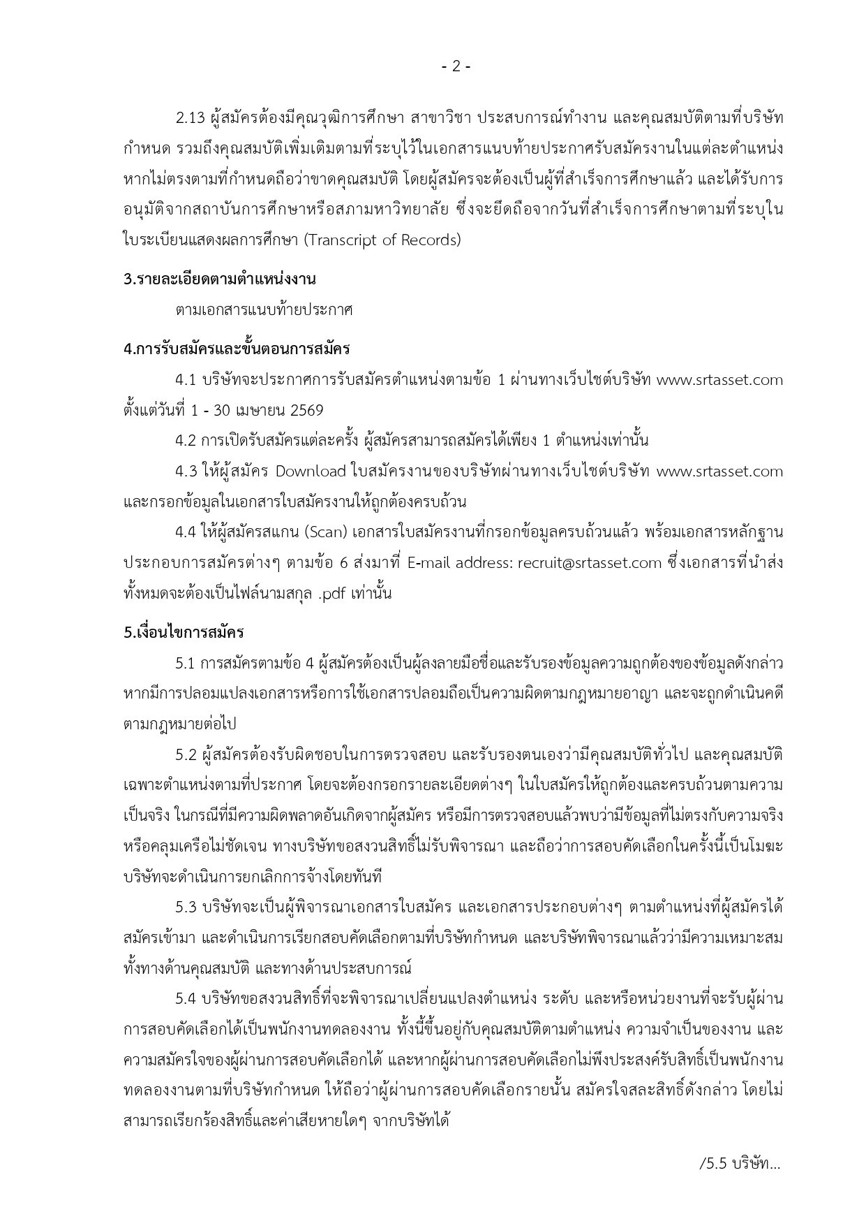 การประกาศรายชื่อผู้มีสิทธิสอบ: บริษัทจะพิจารณาคุณสมบัติเบื้องต้น และประกาศรายชื่อผู้มีสิทธิเข้ารับการสอบข้อเขียนและสอบสัมภาษณ์ทางเว็บไซต์ www.srtasset.com
