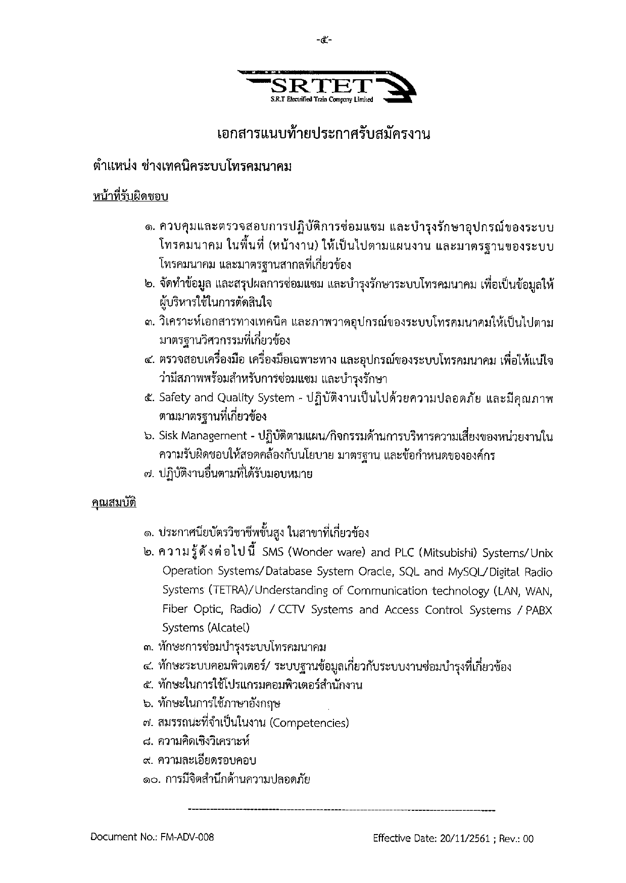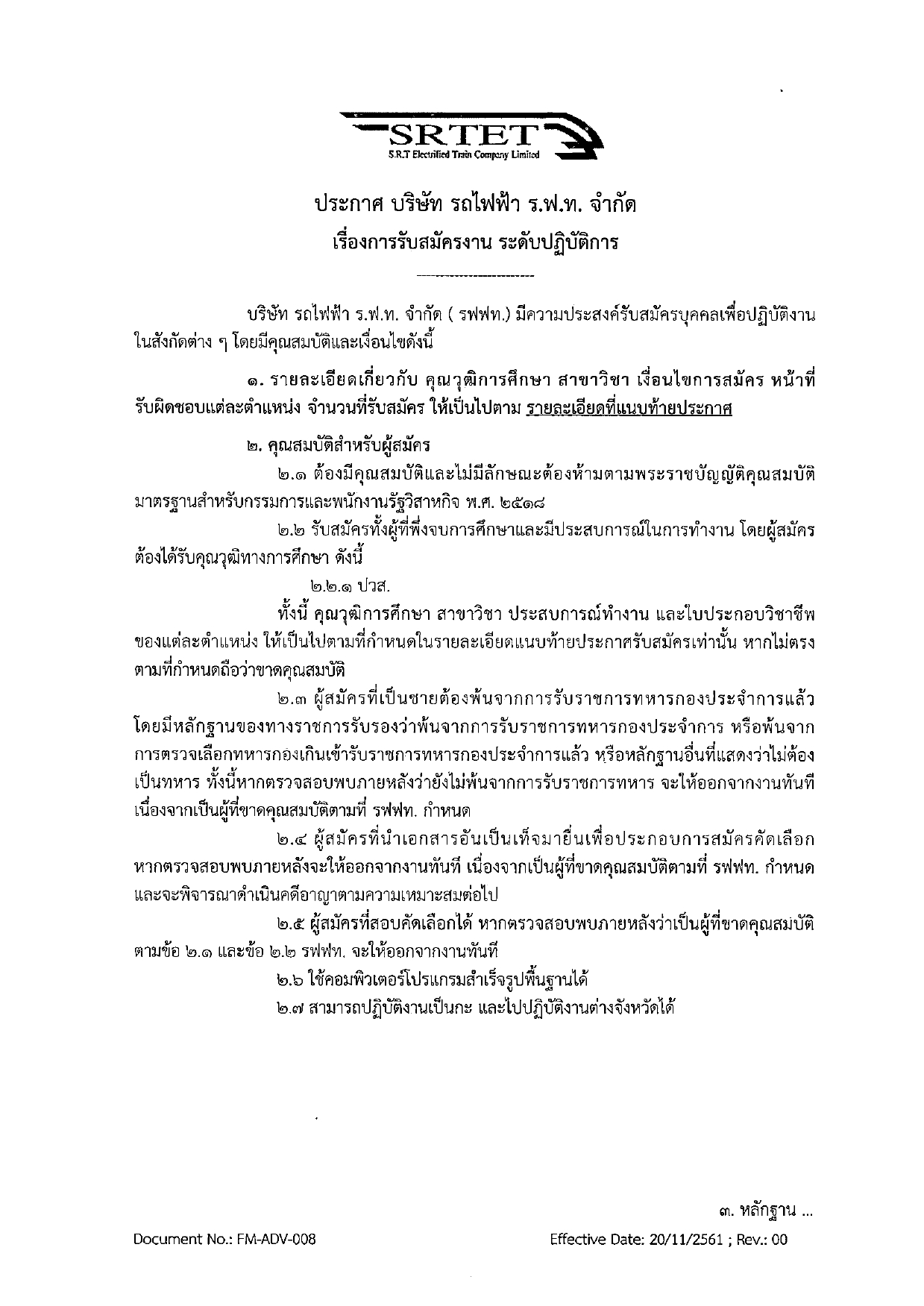 รถไฟฟ้า ร.ฟ.ท. จำกัด มีความประสงค์จะรับสมัครบุคคลภายนอกเพื่อคัดเลือกและบรรจุเป็นพนักงานในตำแหน่งต่างๆ ดังนี้