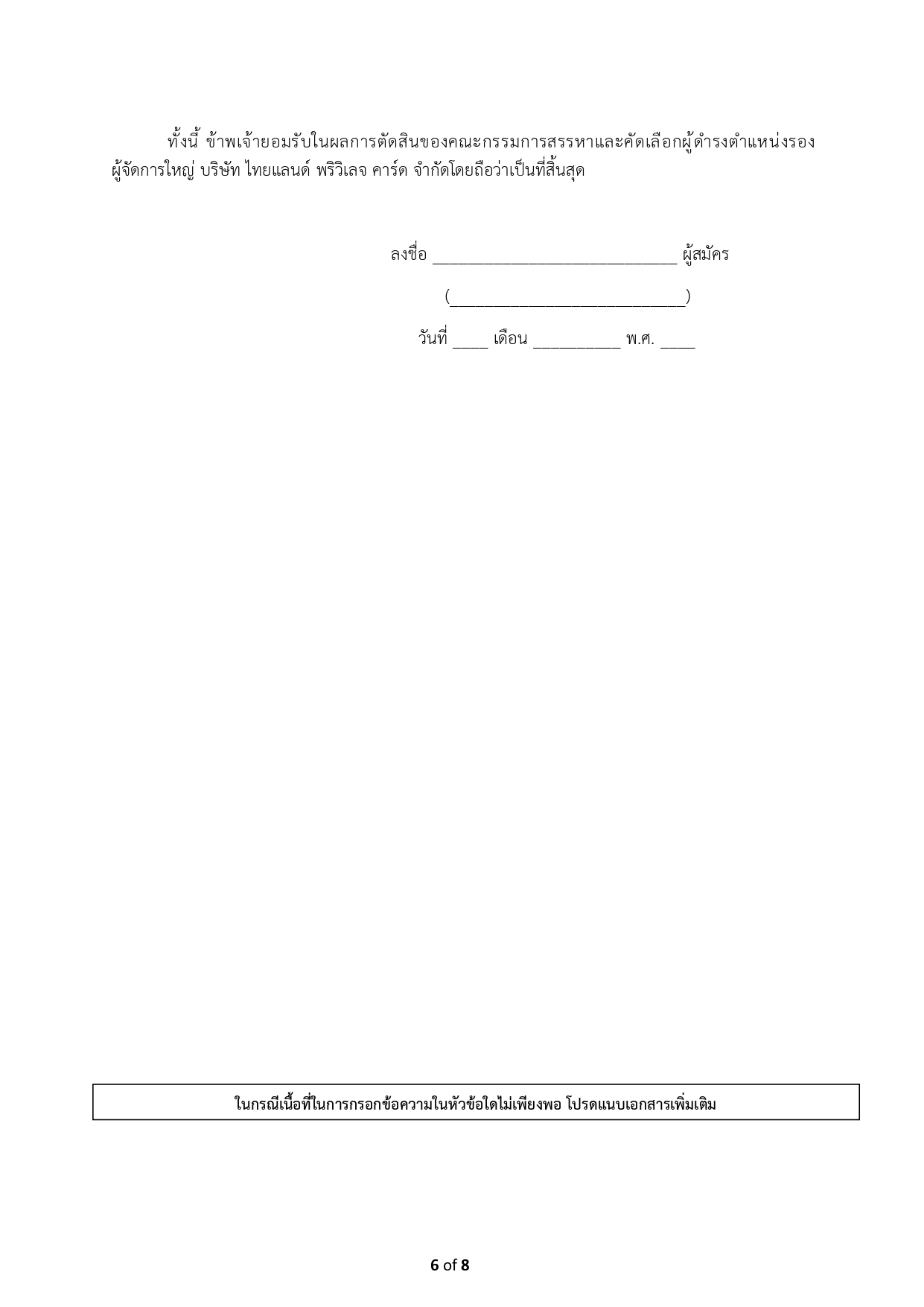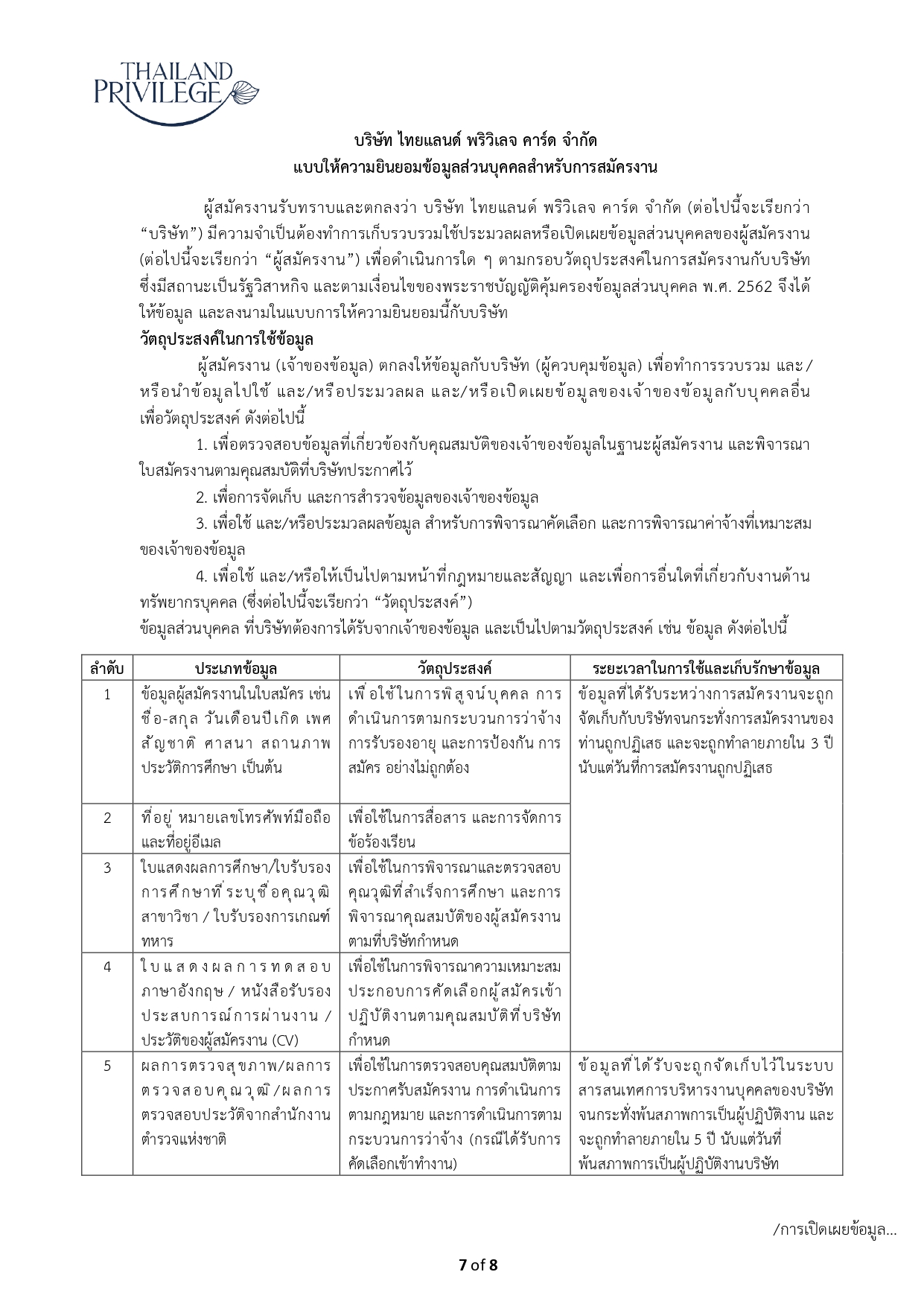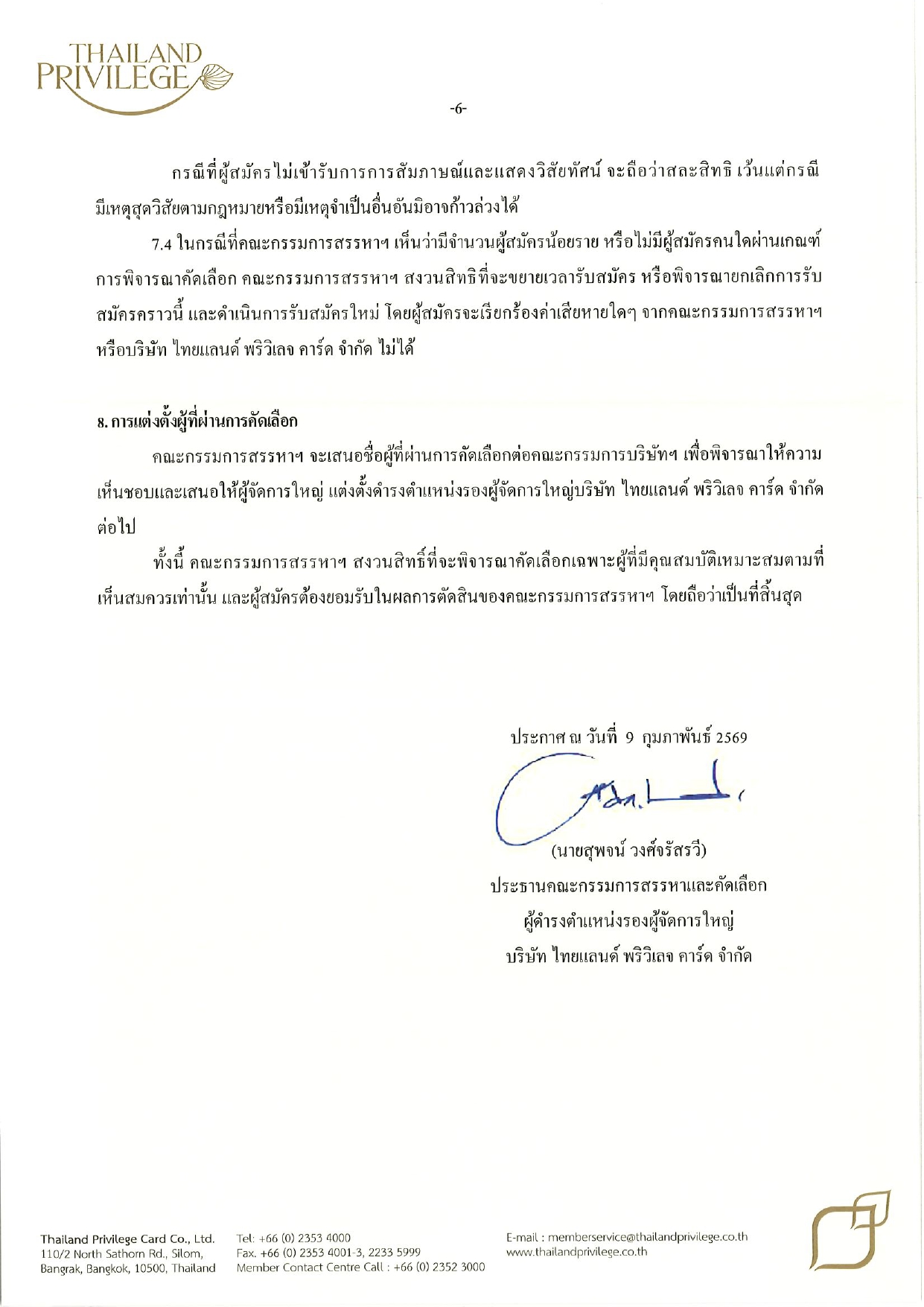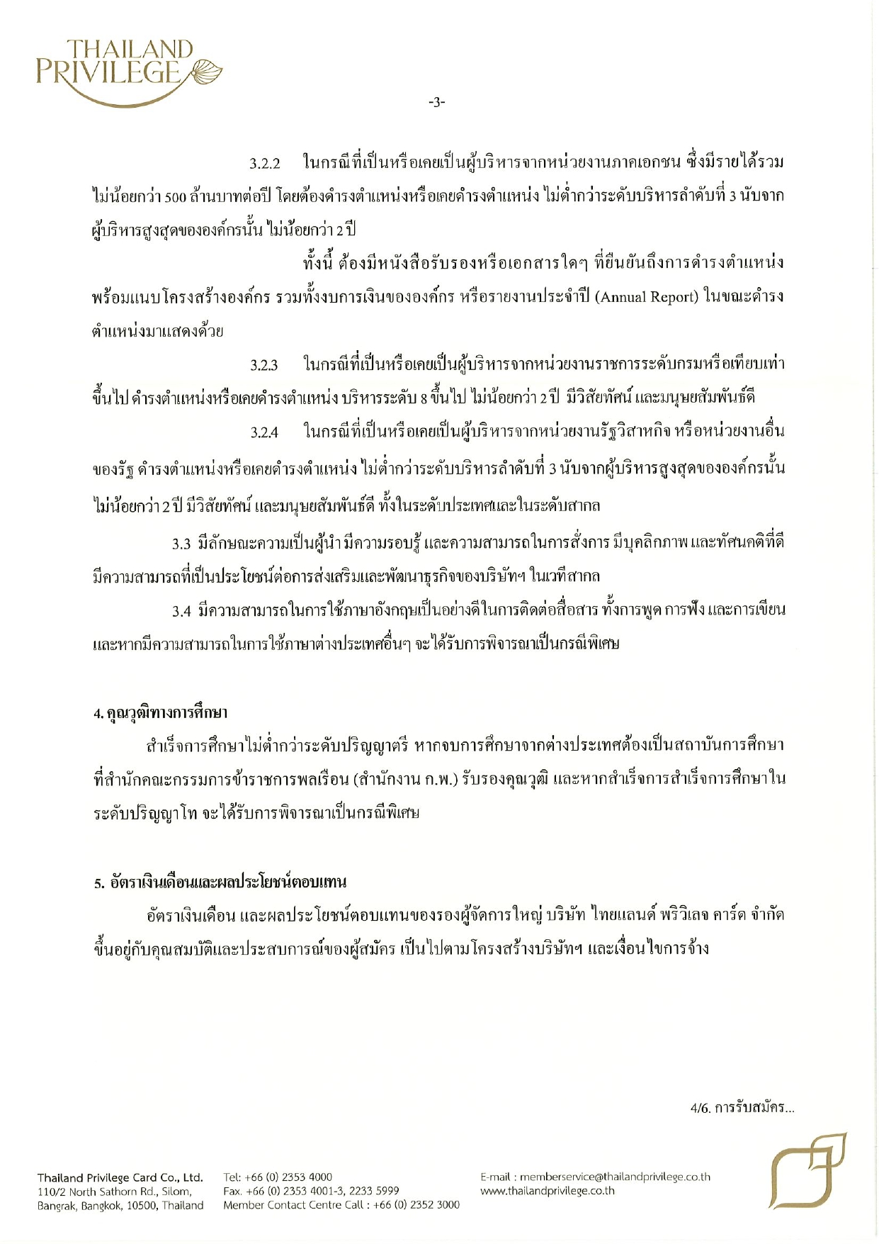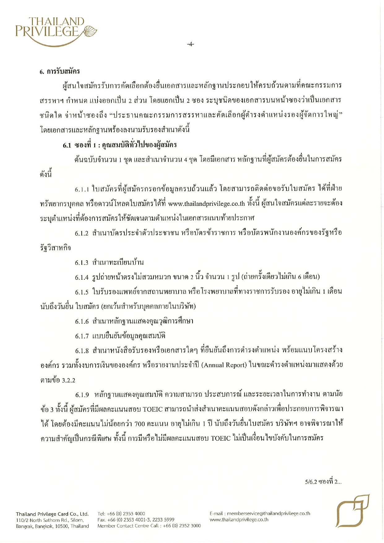 บริษัท ไทยแลนด์ พริวิเลจ คาร์ด จำกัด เลขที่ 110/2 ถนนสาทรเหนือ แขวงสีลม เขตบางรัก กรุงเทพมหานคร 10500 (ระบุหน้าซองถึง “ประธานคณะกรรมการสรรหาและคัดเลือกผู้ดำรงตำแหน่งรองผู้จัดการใหญ่”)
