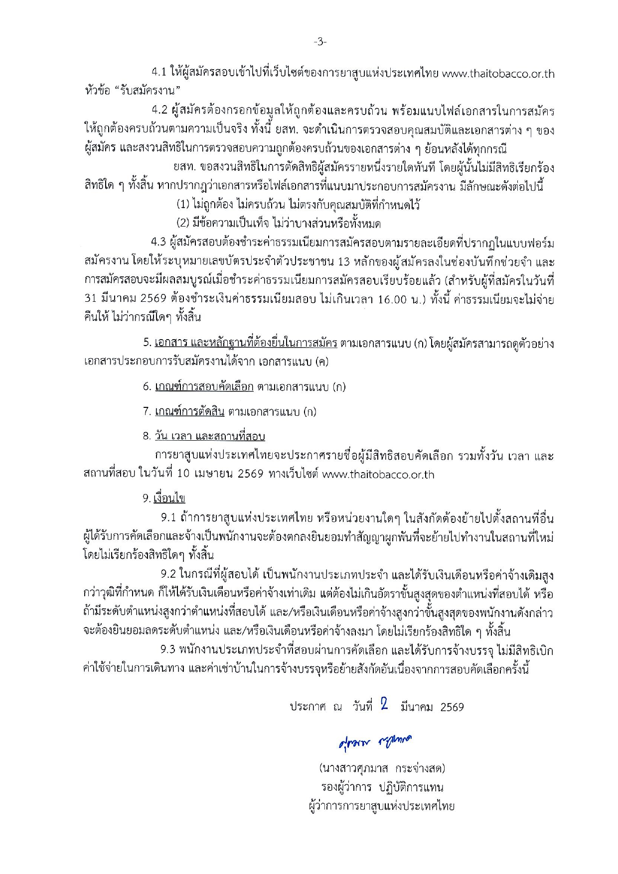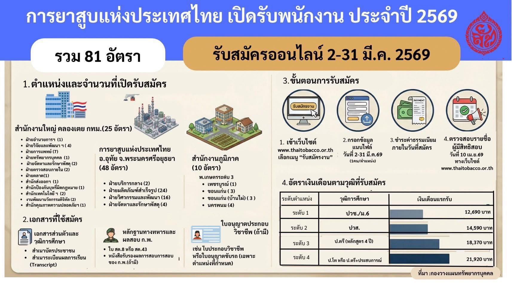 การยาสูบแห่งประเทศไทย รับสมัครสอบคัดเลือกพนักงาน 81 อัตรา บรรจุส่วนกลาง และ ส่วนภูมิภาค / หลายตำแหน่ง / ปริญญาตรี หลายสาขา ขึ้นไป / เงินเดือน 10150 – 62900 / สมัคร online 2 – 31 มีนาคม 2569