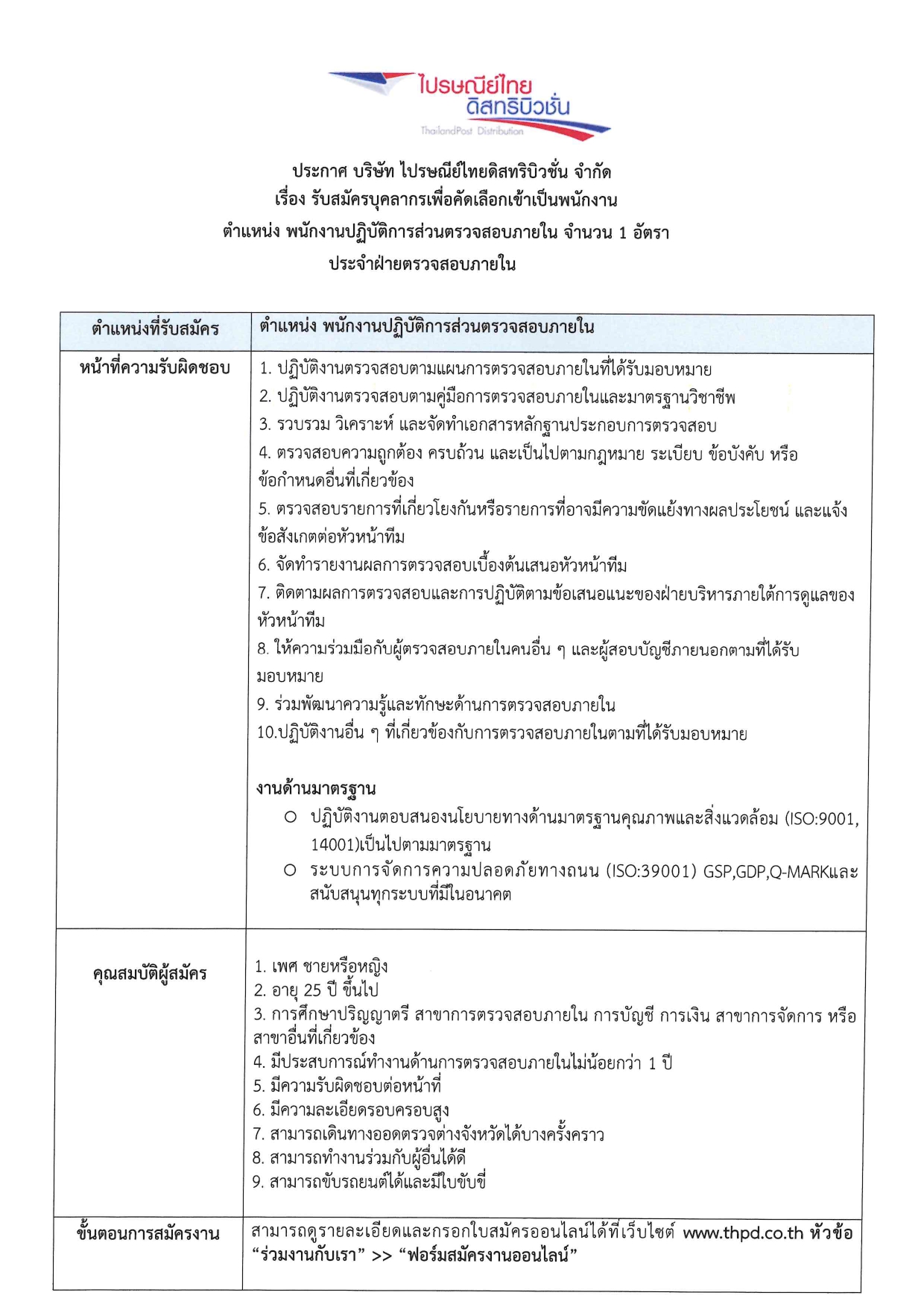 ตำแหน่ง: พนักงานปฏิบัติการส่วนตรวจสอบภายใน (จำนวน 1 อัตรา)